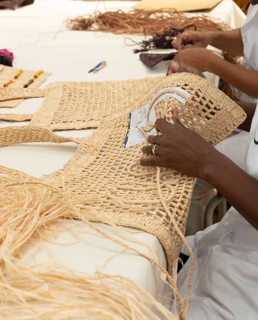 当然!拉菲草一直是马达加斯加的文化遗产之一,被视为一种高贵的纤维——全世界约80%的拉菲草都来自这个国家。利用这种传统材料和本地的手工艺,我创作了一个大约十件作品的小系列,并把它带到了米兰。人们鼓励我去联系陈列室(showrooms),那时我对这一切还一无所知。后来我与时尚行业建立了联系,并参加了 White 展会,他们要求我在短短几个月内生产一千件作品。那段时间非常紧张,但也让我和合作的女性们建立了深厚而直接的联系。每天我都在现场——从早上七点到晚上七点——亲自监督每一个包的制作,因为每一件作品都是纯手工完成的。更重要的是,这段经历让我有机会真正了解每一位女性——她们的故事、她们的困难,以及她们的力量。
